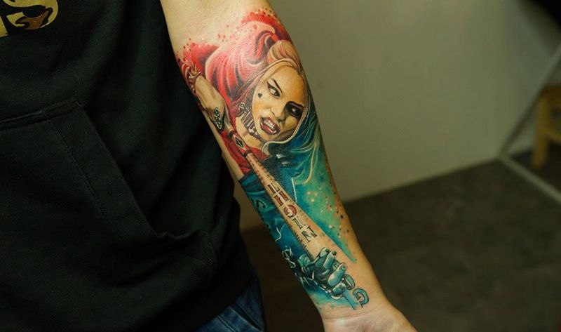哈莉·奎茵纹身图片_成品手臂欧美写实人物自杀小队纹身图案