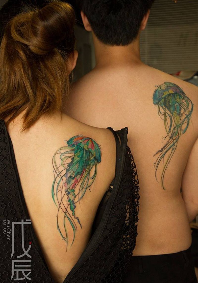 当前位置: 首页 >重庆市纹身店-戊辰刺青纹身图案>水母情侣纹身纹身图片_成品背部清新欧美动物水彩刺秦彩色水彩水墨水母纹身图案