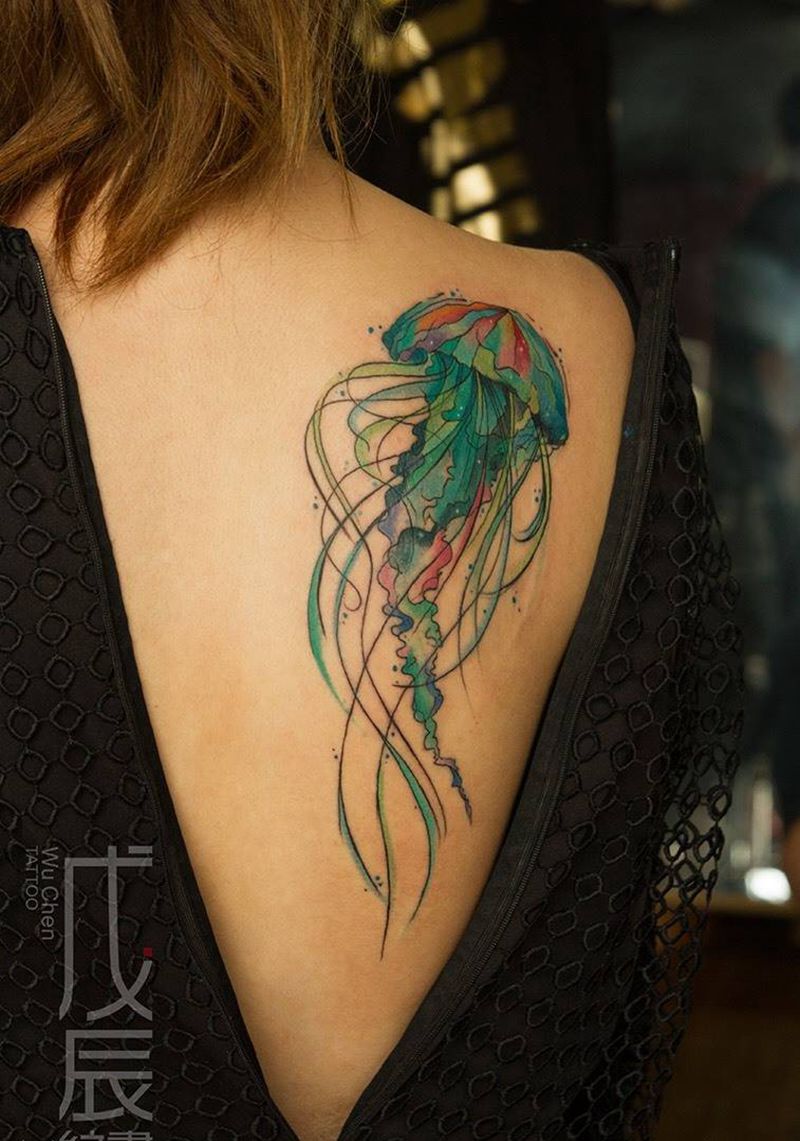 当前位置: 首页 >重庆市纹身店-戊辰刺青纹身图案>水母情侣纹身纹身图片_成品背部清新欧美动物水彩刺秦彩色水彩水墨水母纹身图案