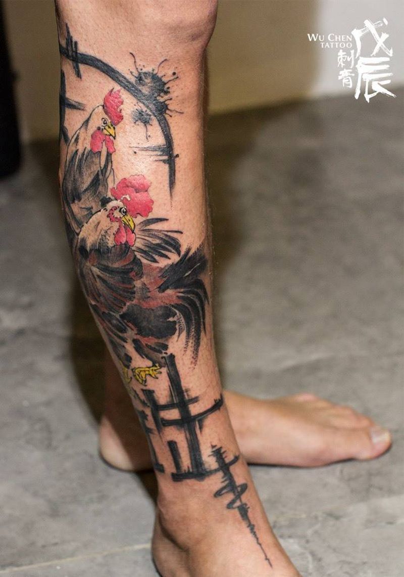 当前位置: 首页 >重庆市纹身店-戊辰刺青纹身图案>大公鸡纹身图片_成品腿部传统国画彩色水墨水墨中国风公鸡纹身图案