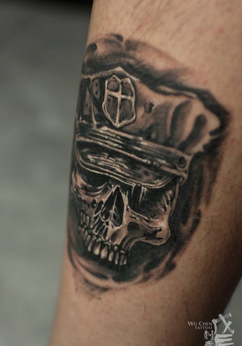 骷髅将军纹身图片_成品腿部欧美写实骷髅骷髅欧美刺青素描刺青遮盖纹身图案