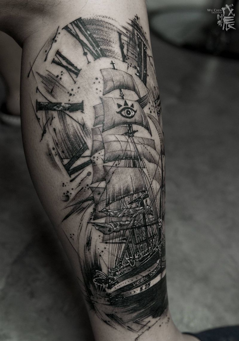 帆纹身图片_腿部欧美写实水彩帆船纹身图案