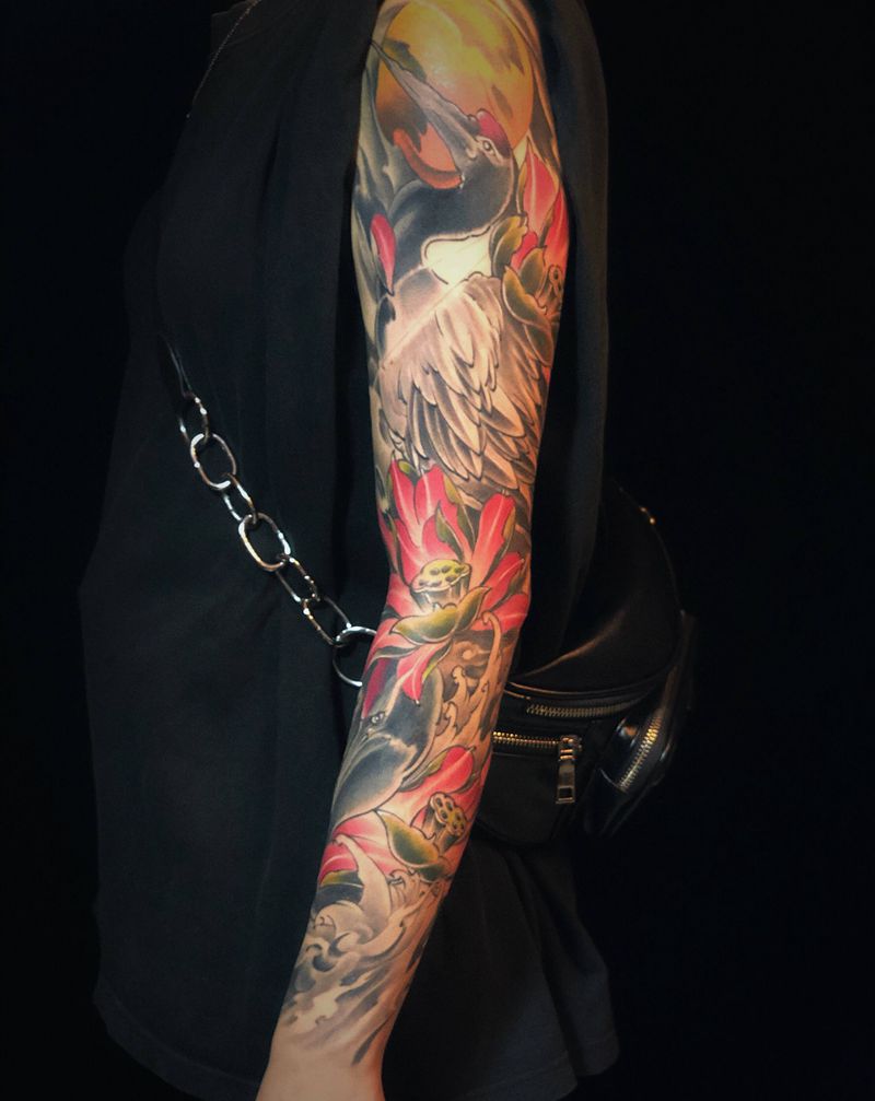 (洁)纹身图片_手臂手部新传统老传统鹤 荷花纹身图案