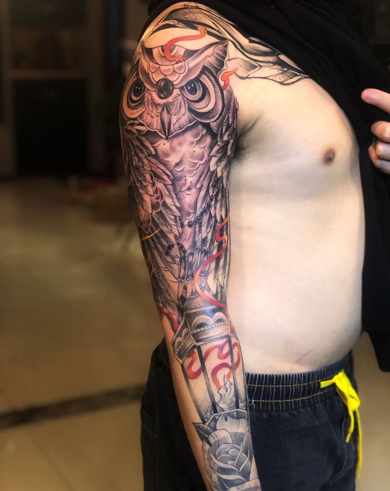 猫头鹰纹身图片_手部手臂New School欧美写实纹身图案