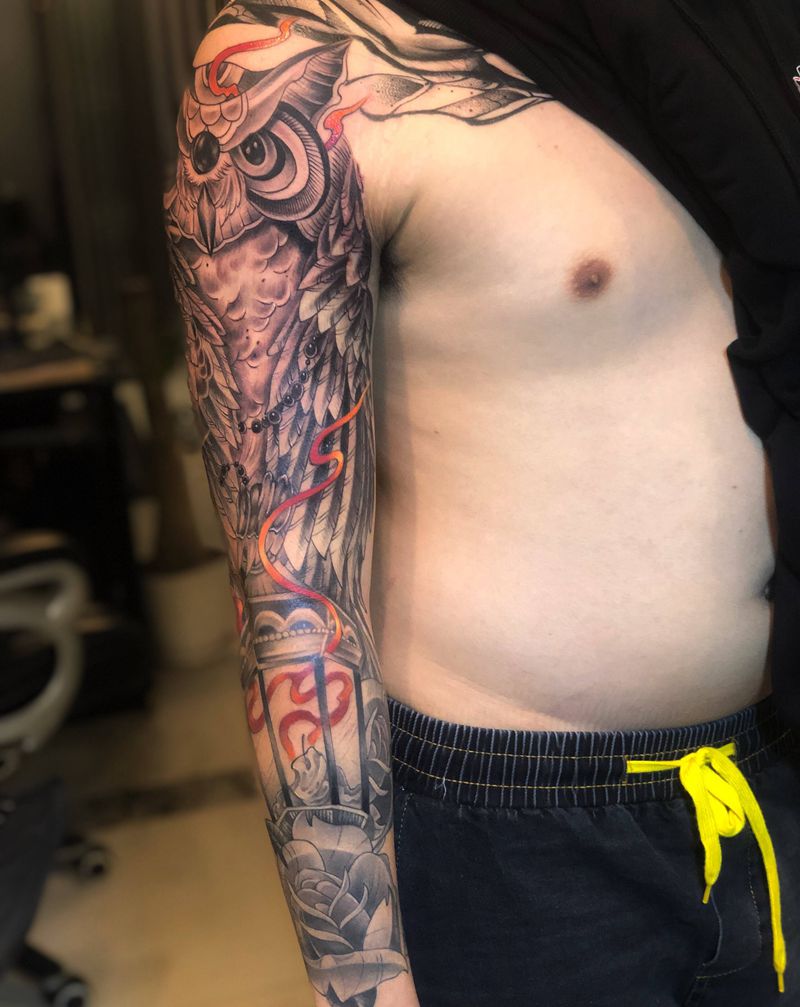 猫头鹰纹身图片_手部手臂New School欧美写实纹身图案