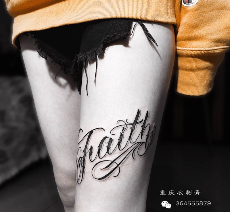 当前位置: 首页 >重庆市纹身店-重庆农刺青纹身工作室纹身图案>奇卡诺纹身图片_腿部臀部花体字英文信仰奇卡诺纹身图案