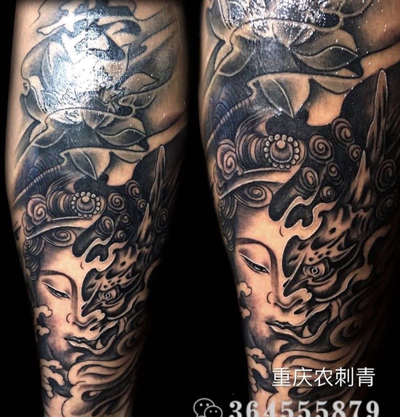 善恶一念纹身图片_成品腿部传统宗教纹身图案