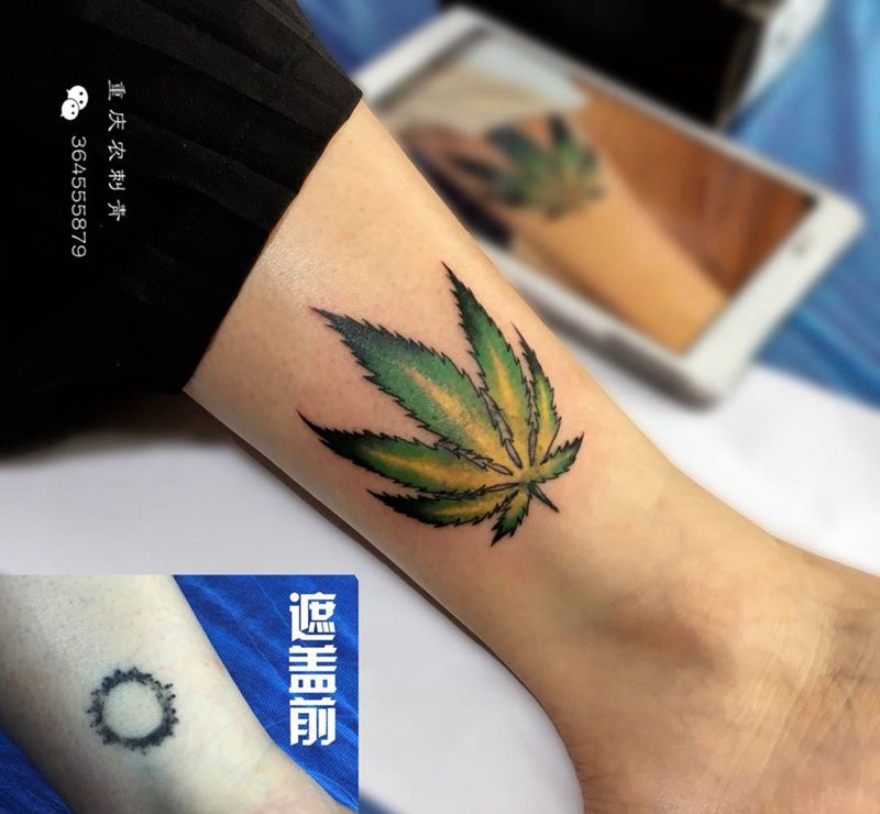 遮盖失败纹身纹身图片_脚部腿部新传统麻叶植物纹身图案