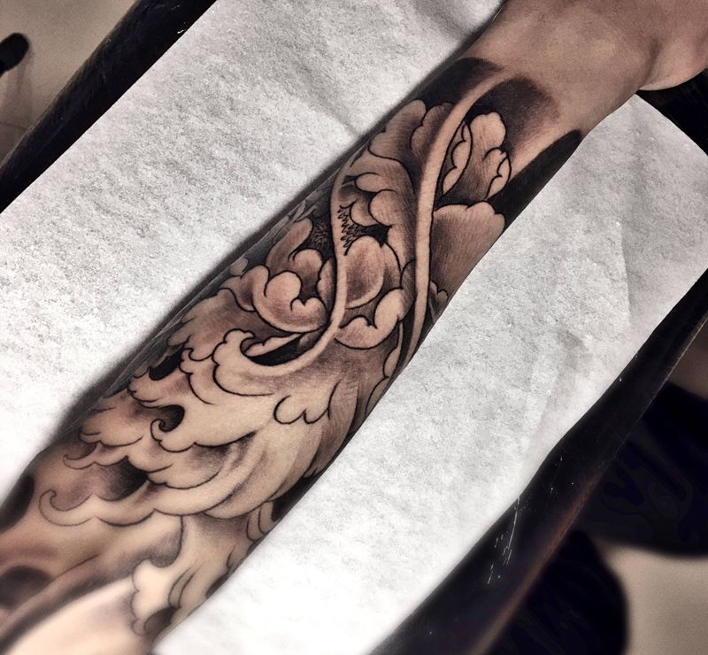 艺妓花臂纹身图片_手臂手部新传统艺妓牡丹浪花纹身图案