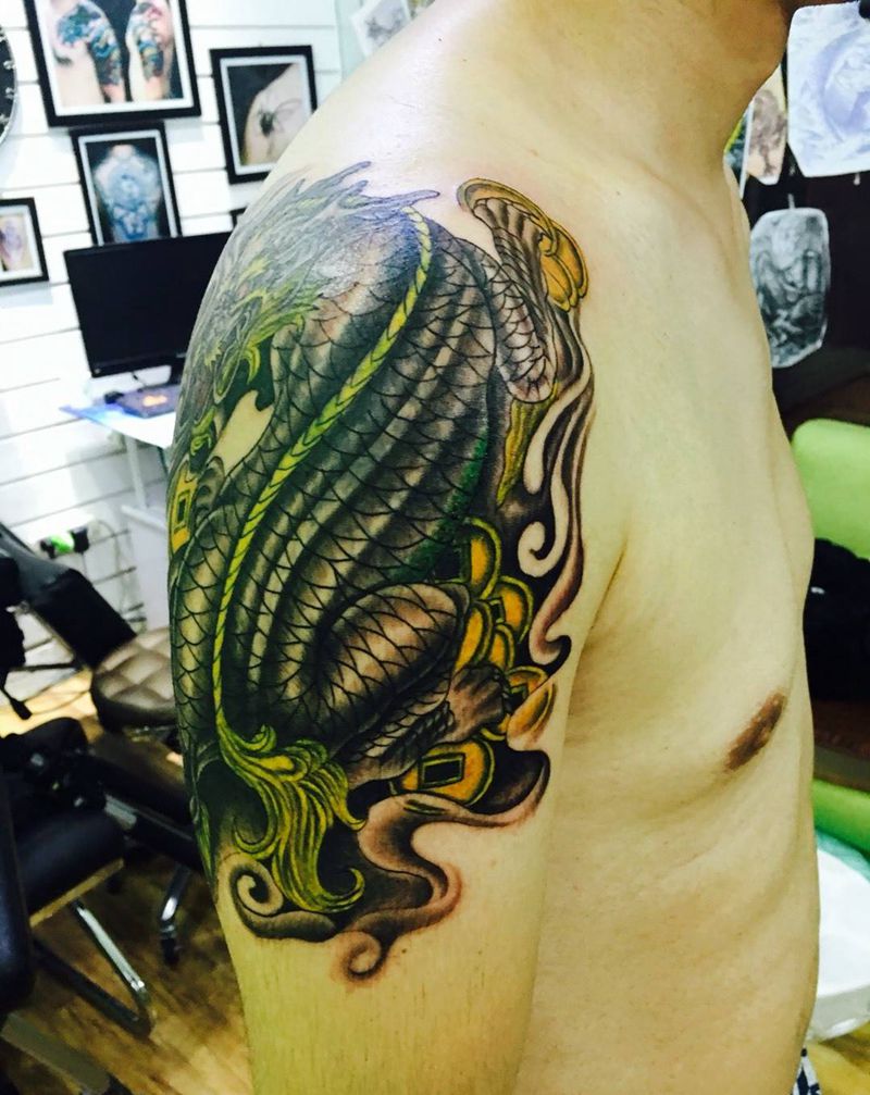 • T网红王老大花腿龙纹身图片_腿部新传统纹身图案