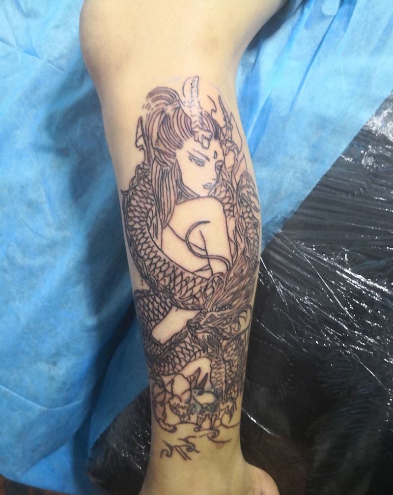 • T网红王老大花腿龙纹身图片_腿部新传统纹身图案