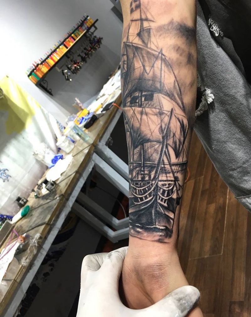 帆船纹身图片_手稿成品手臂欧美写实纹身图案