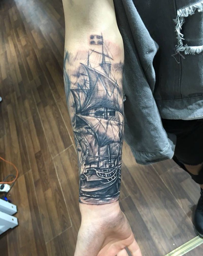帆船纹身图片_手稿成品手臂欧美写实纹身图案