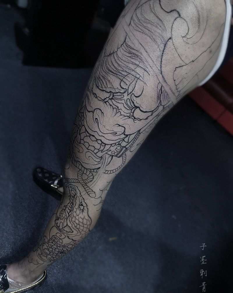 • T网红王老大花腿龙纹身图片_腿部新传统纹身图案