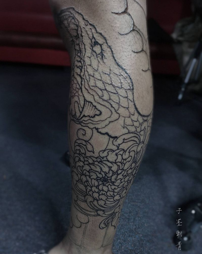 • T网红王老大花腿龙纹身图片_腿部新传统纹身图案