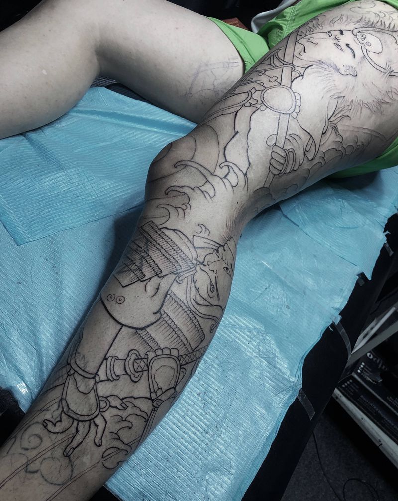 • T网红王老大花腿龙纹身图片_腿部新传统纹身图案