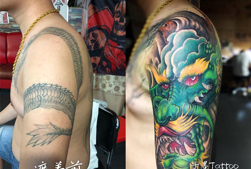 当前位置: 首页 >重庆市纹身店-子墨刺青工作室纹身图案>龙头遮盖纹身图片_手臂新传统龙头纹身图案