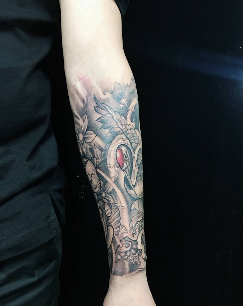 仙鹤与招财猫的碰撞纹身图片_手臂新传统纹身图案