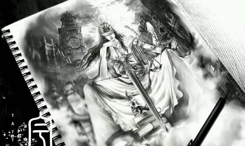 正义女神升级版纹身图片_背部欧美写实鬼神宗教原创手稿纹身图案