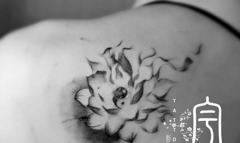 当前位置: 首页 >四川省成都市纹身店-成都祥宇私人定制纹身纹身图案>水墨莲花太极纹身图片_成品背部国画植物纹身图案