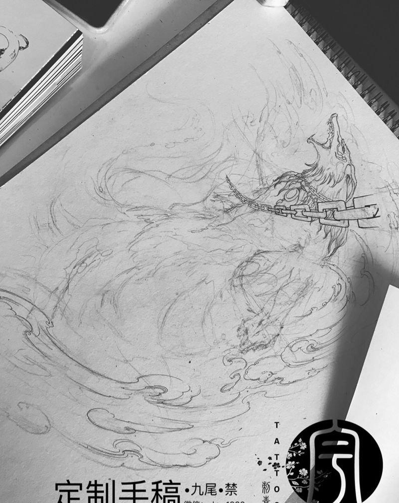 当前位置: 首页 >四川省成都市纹身店-成都祥宇私人定制纹身纹身图案>九尾纹身图片_手稿脚部传统原创鬼神纹身图案