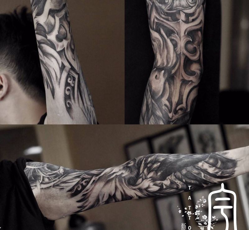 小臂遮盖接花臂纹身图片_成品手臂写实欧美原创纹身图案