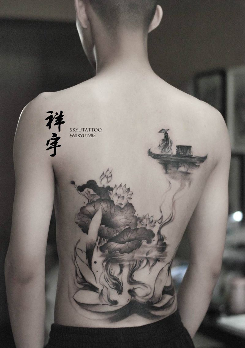 当前位置: 首页 >四川省成都市纹身店-成都祥宇私人定制纹身纹身图案>传统水墨纹身图片_成品背部传统国画原创植物人物纹身图案