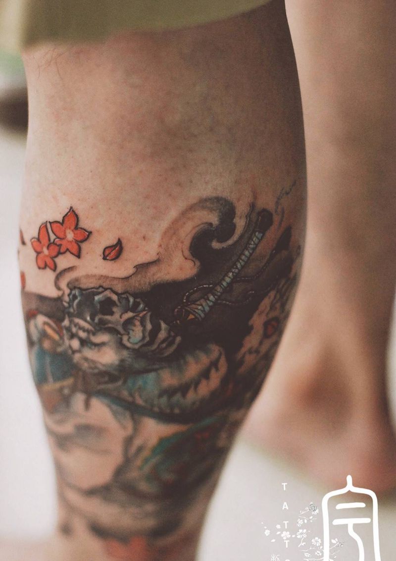 • T网红王老大花腿龙纹身图片_腿部新传统纹身图案