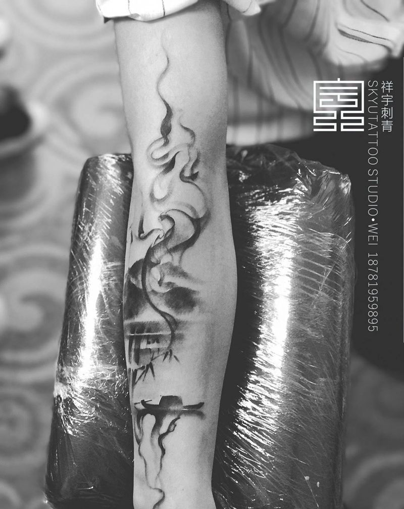 当前位置: 首页 >四川省成都市纹身店-成都祥宇私人定制纹身纹身图案>写意山水纹身图片_成品手臂传统原创纹身图案