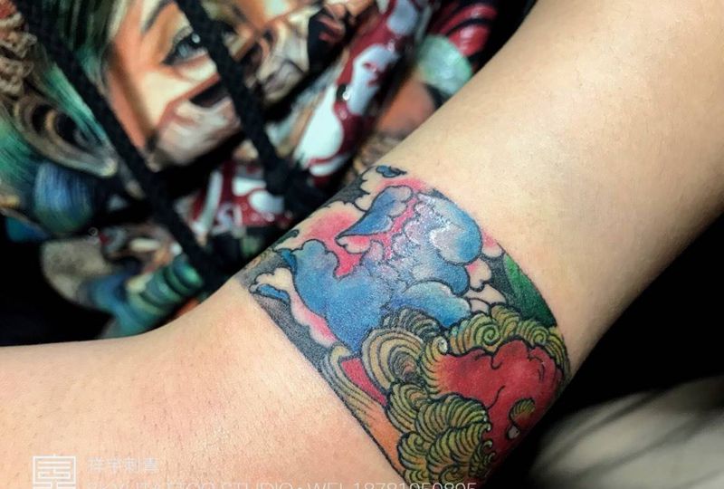 唐狮遮盖手环纹身图片_成品手臂传统动物植物纹身图案