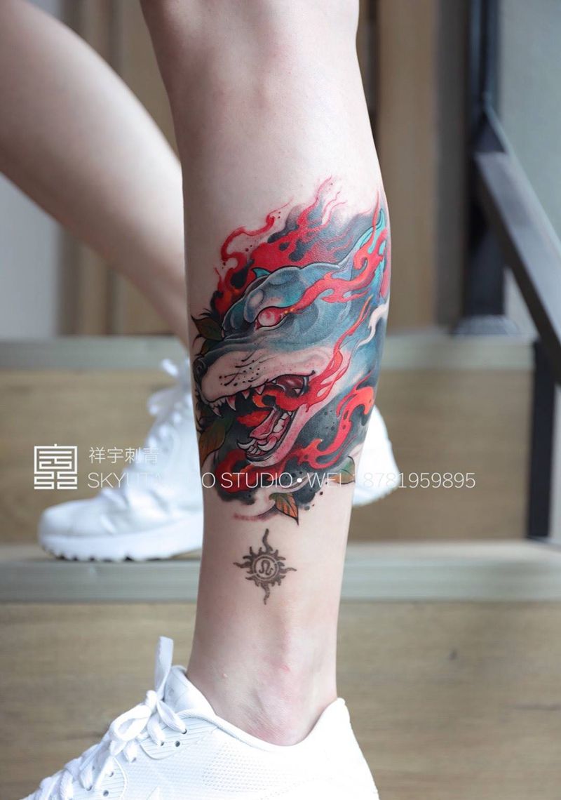 暴炎猎犬纹身图片_成品脚部欧美原创动物纹身图案