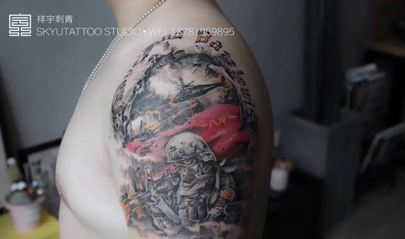 当前位置: 首页 >四川省成都市纹身店-成都祥宇私人定制纹身纹身图案>红色战魂纹身图片_成品手臂写实原创人物纹身图案