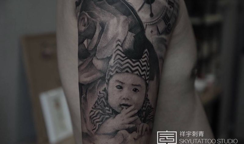 当前位置: 首页 >四川省成都市纹身店-成都祥宇私人定制纹身纹身图案>家人纹身图片_手臂欧美写实家人肖像纹身图案