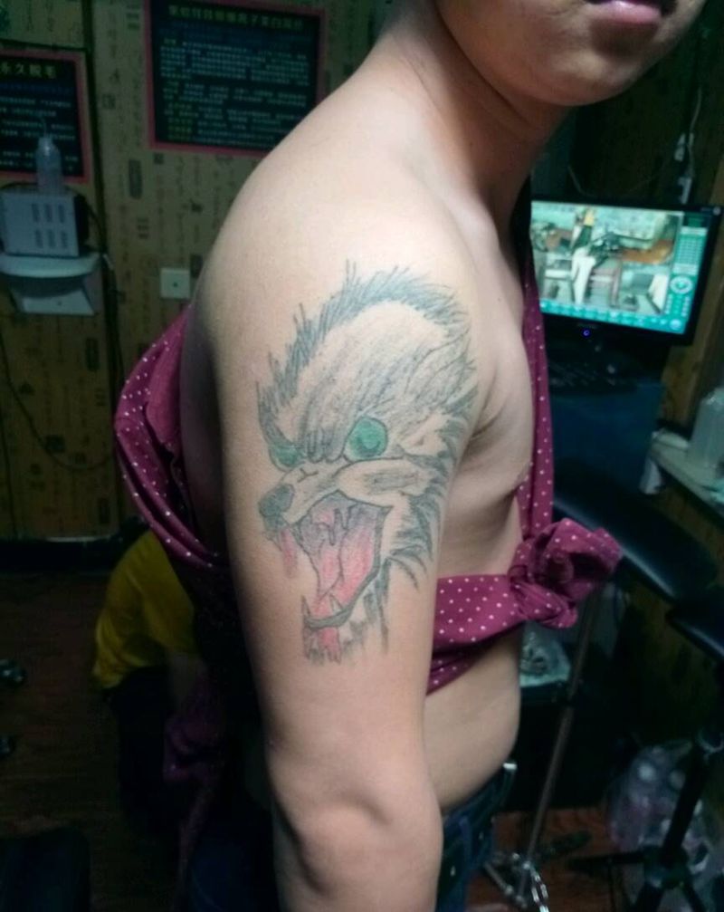 当前位置: 首页 >重庆市纹身店-天台盘古纹身脏辫纹身图案>半甲遮盖狼头纹身图片_肩部胸部传统动物人物鬼神宗教成品纹身图案