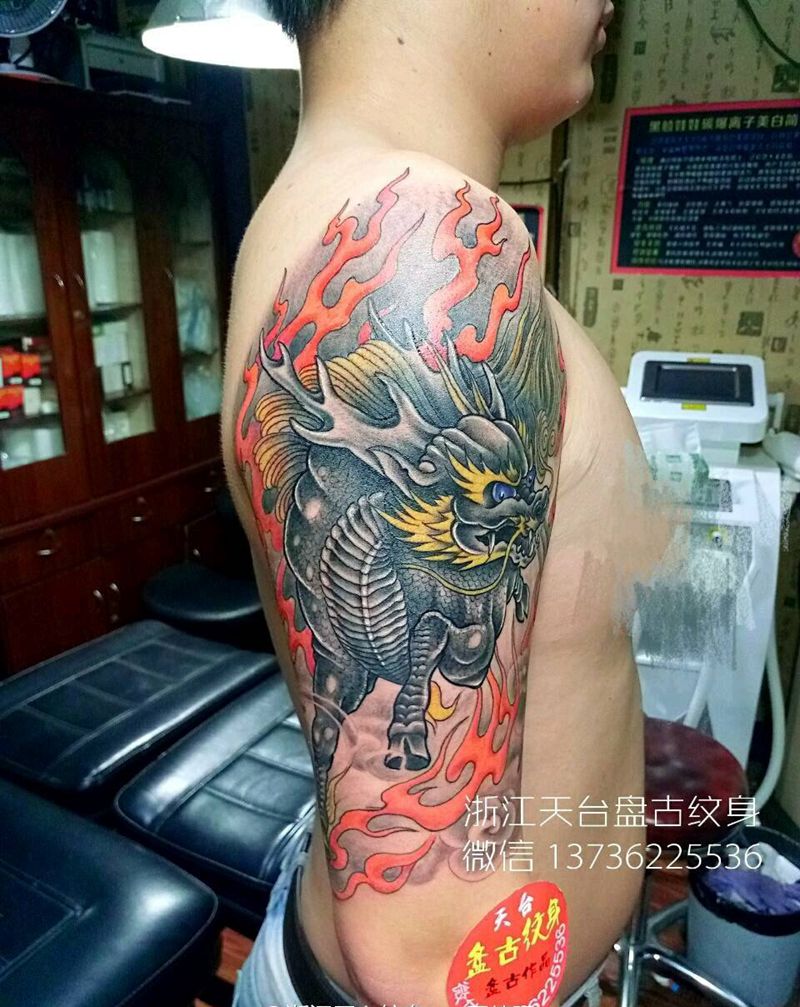 当前位置: 首页 >重庆市纹身店-天台盘古纹身脏辫纹身图案>麒麟纹身图片_肩部手臂传统动物天台盘古成品纹身图案