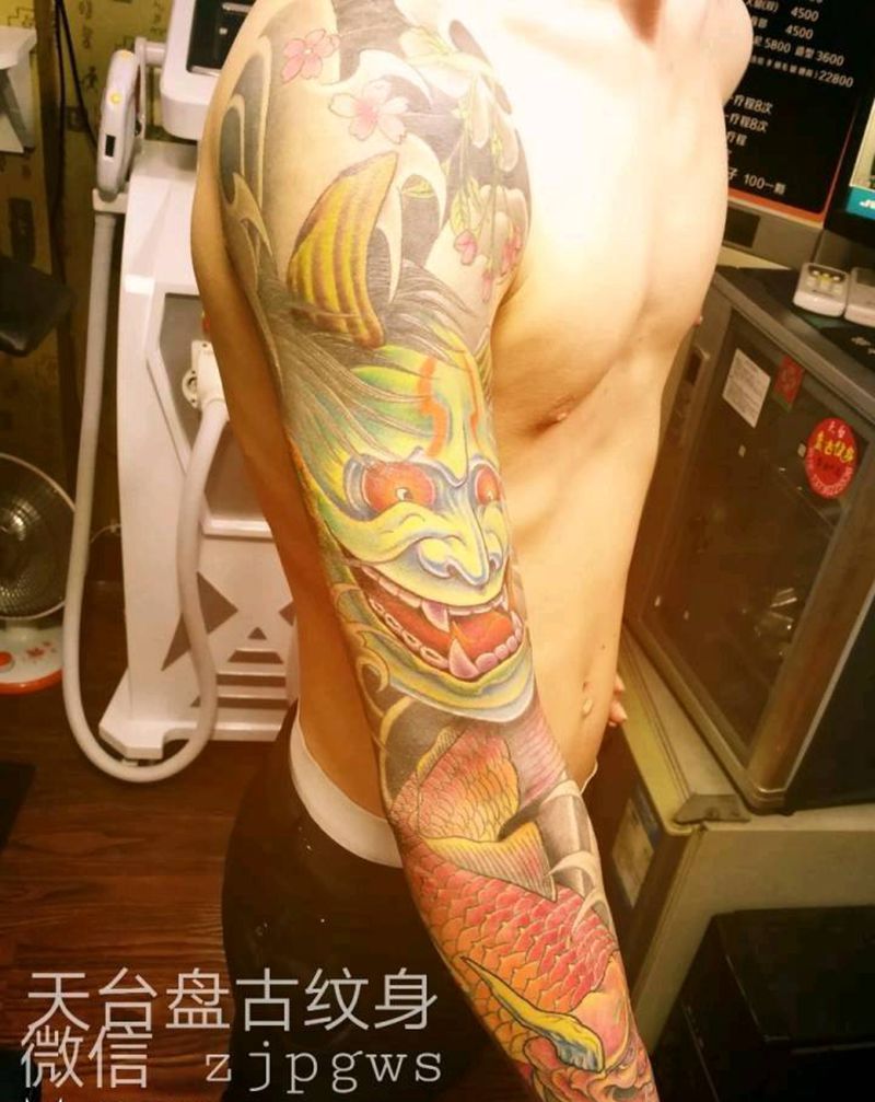 般若鲤鱼传统花臂纹身图片_肩部手臂手部传统鬼神天台盘古盘古成品纹身图案