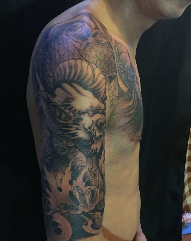 当前位置: 首页 >四川省成都市纹身店-涛刺青tattoo纹身图案>半甲纹身图片_成品胸部手臂传统刺青纹身图案