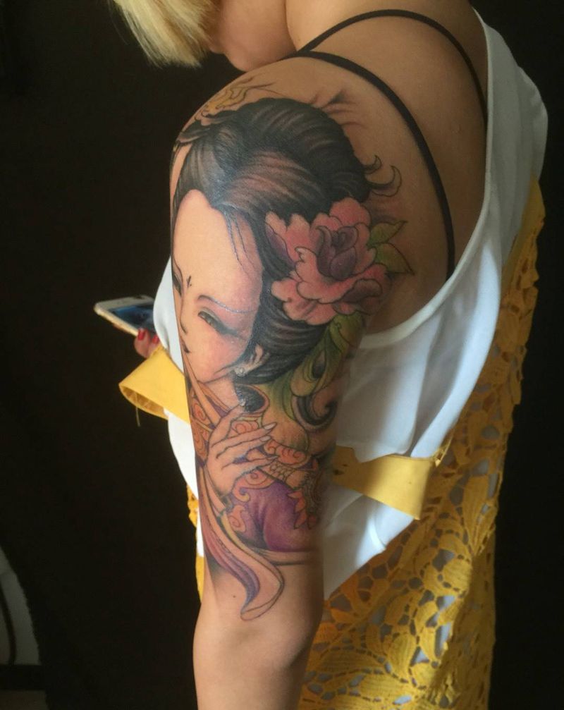 当前位置: 首页 >四川省成都市纹身店-涛刺青tattoo纹身图案>彩色艺妓纹身图片_成品手臂传统人物刺青纹身图案