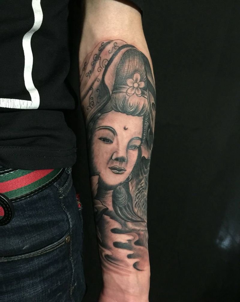 小臂内侧观音纹身图片_成品手臂传统刺青纹身图案