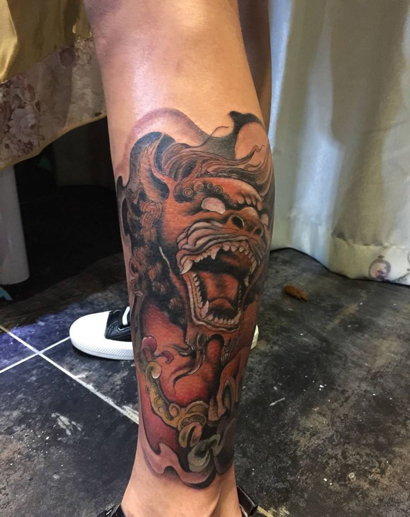 当前位置: 首页 >四川省成都市纹身店-涛刺青tattoo纹身图案>福狮纹身图片_成品腿部传统纹身图案