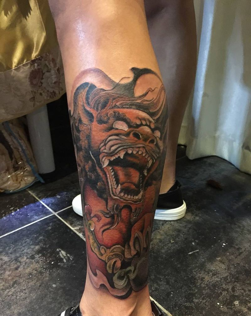 当前位置: 首页 >四川省成都市纹身店-涛刺青tattoo纹身图案>福狮纹身图片_成品腿部传统纹身图案