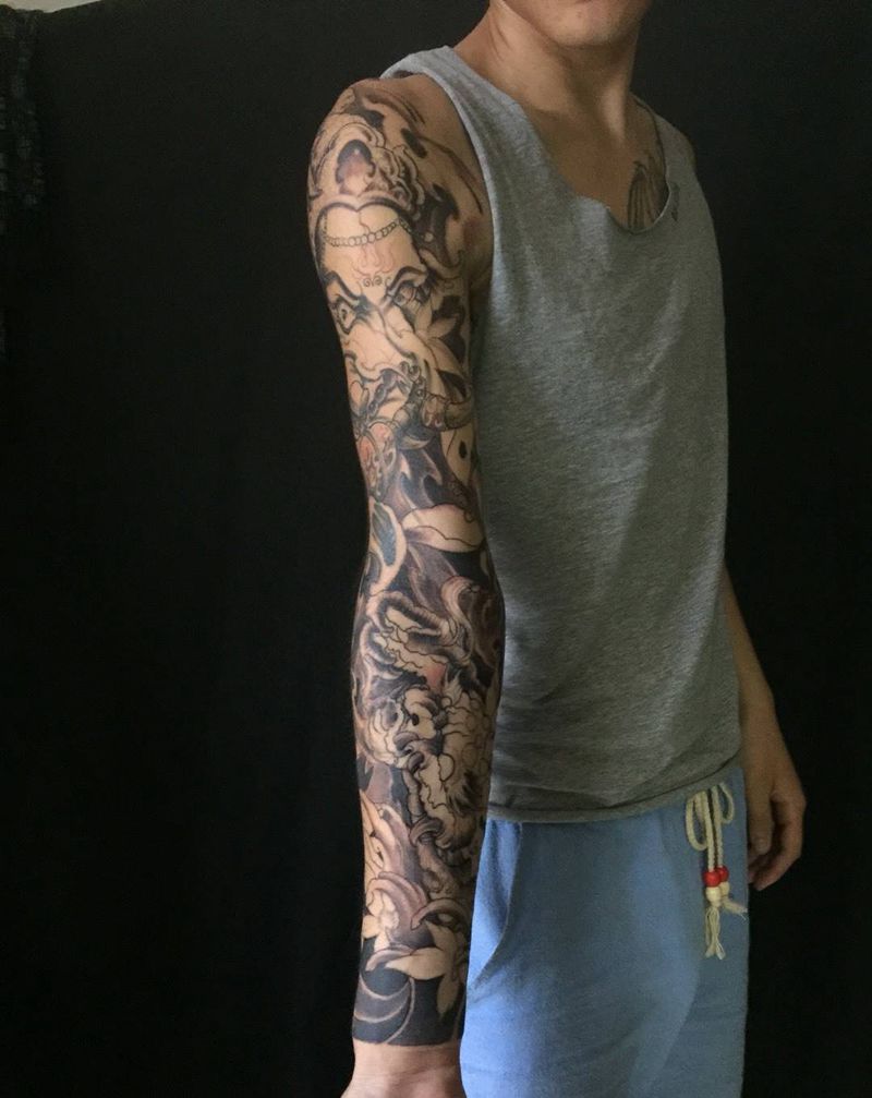 当前位置: 首页 >四川省成都市纹身店-涛刺青tattoo纹身图案>彩色花臂黑灰完成彩色待续纹身图片_成品手臂传统刺青纹身图案