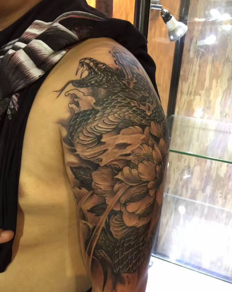 当前位置: 首页 >四川省成都市纹身店-涛刺青tattoo纹身图案>牡丹与蛇纹身图片_成品手臂纹身图案
