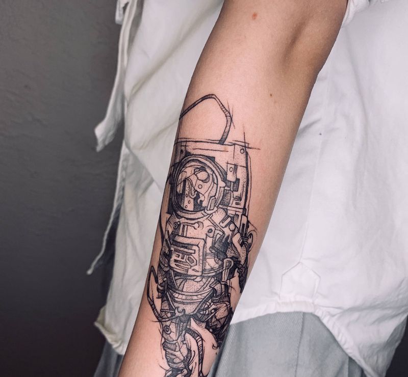 当前位置: 首页 >四川省成都市纹身店-涛刺青tattoo纹身图案>宇航员纹身图片_手臂点刺纹身图案