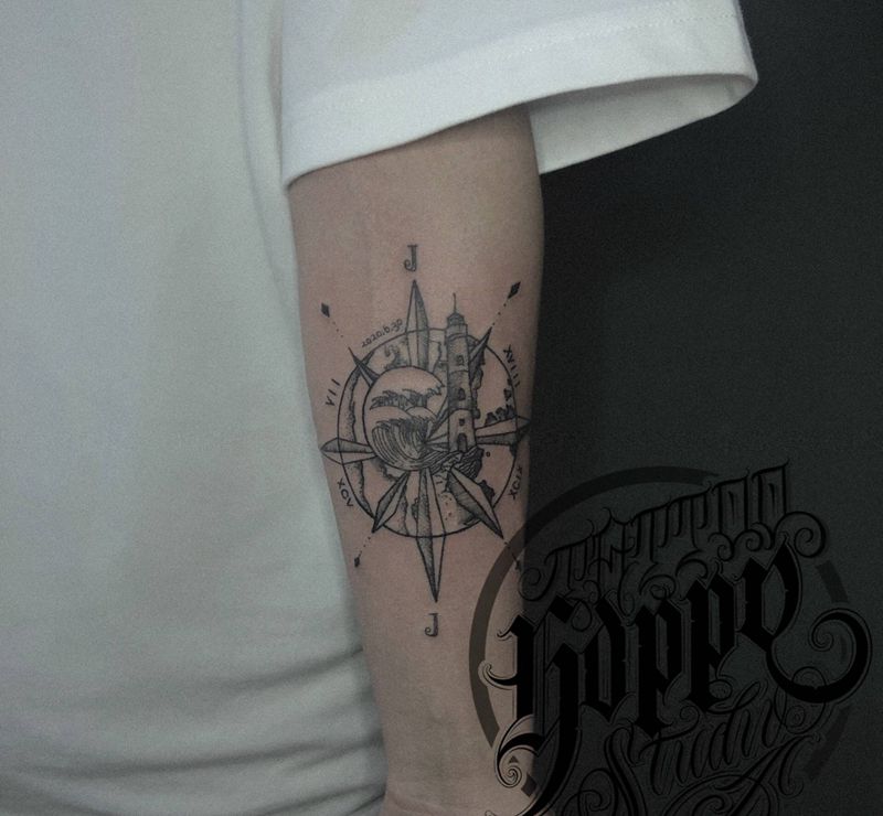 当前位置: 首页 >四川省成都市纹身店-快樂刺青纹身图案>指南针纹身图片_手臂点刺纹身图案
