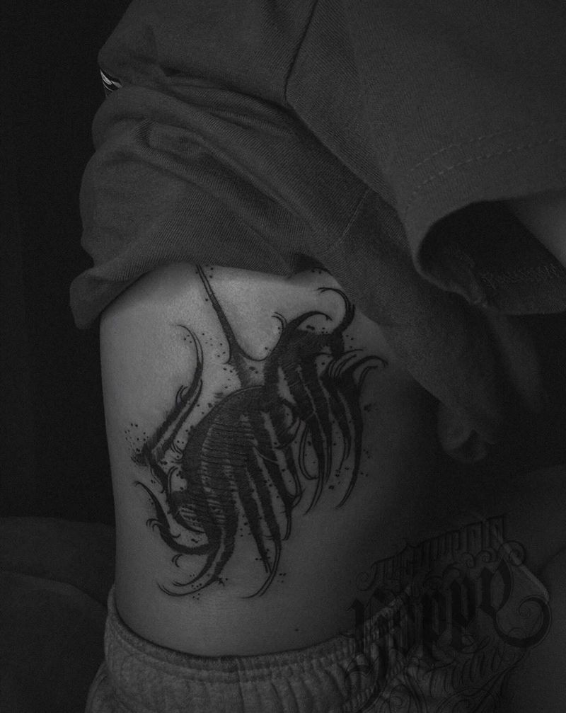 暗黑花体遮盖纹身图片_腹部腰部花体字纹身图案
