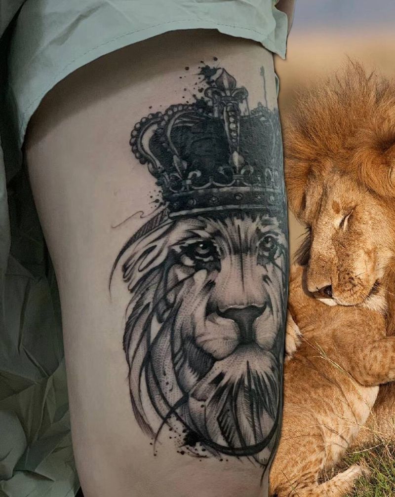 狮子纹身图片_腿部点刺欧美写实纹身图案