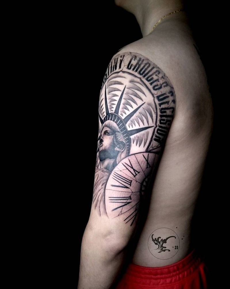 当前位置: 首页 >四川省成都市纹身店-小龙刺青纹身图案>自由女神&时光阶梯纹身图片_肩部手臂欧美写实钟表女神蚀刻纹身图案