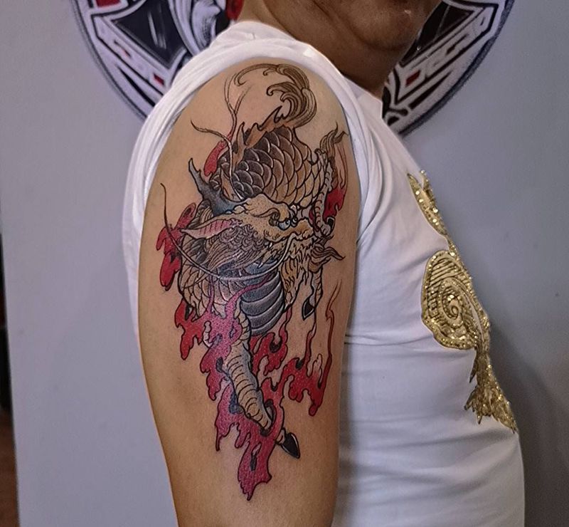 当前位置: 首页 >四川省成都市纹身店-千灵刺青纹身图案>麒麟纹身图片_手臂新传统纹身图案