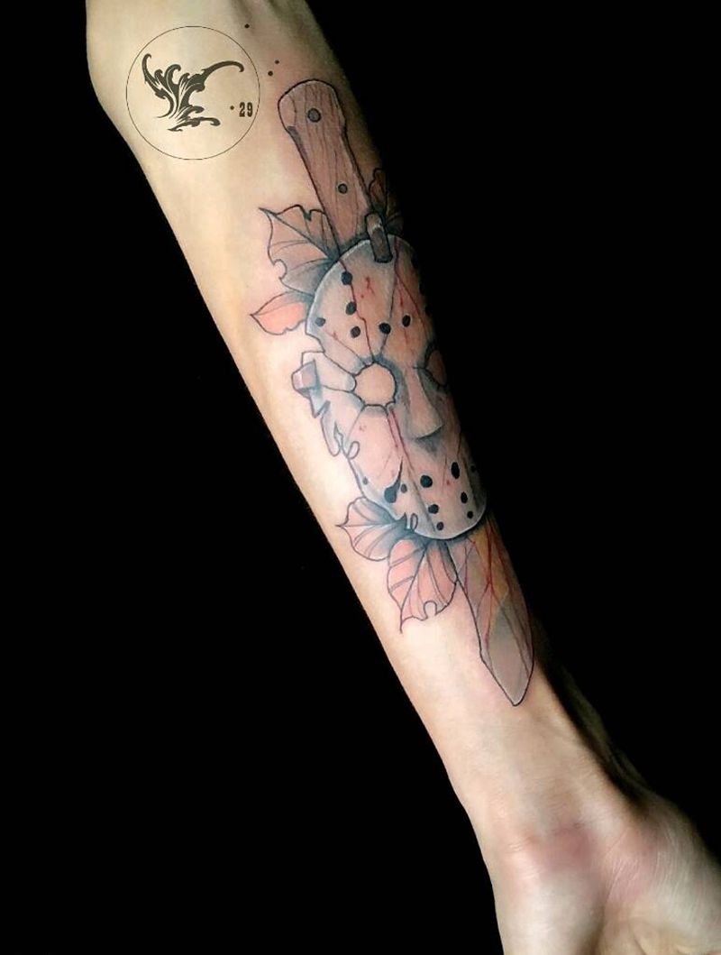 当前位置: 首页 >四川省成都市纹身店-小龙刺青纹身图案>十三号星期五newschool纹身图片_手臂欧美面具彩色刀叶子血液成品纹身图案